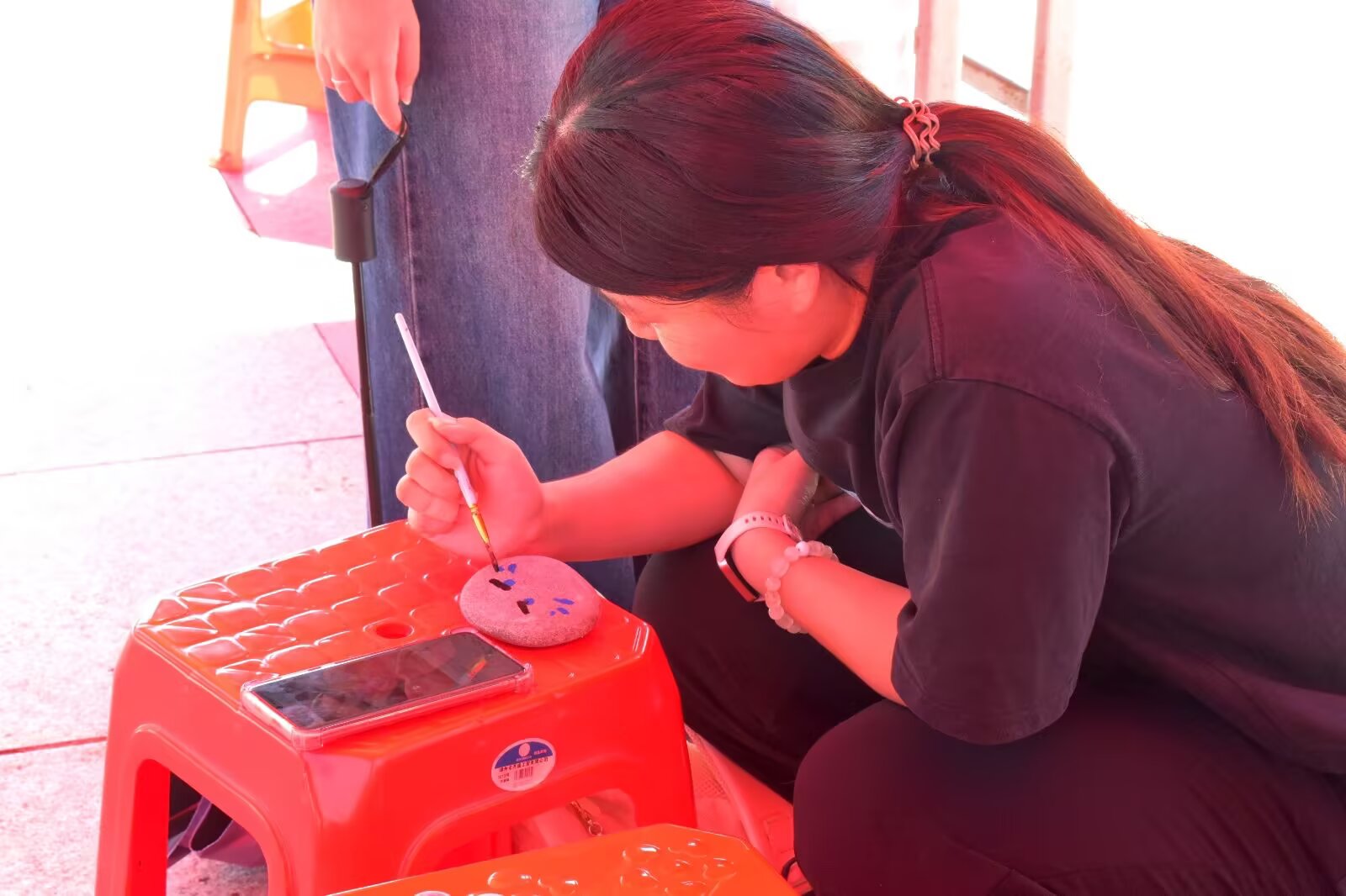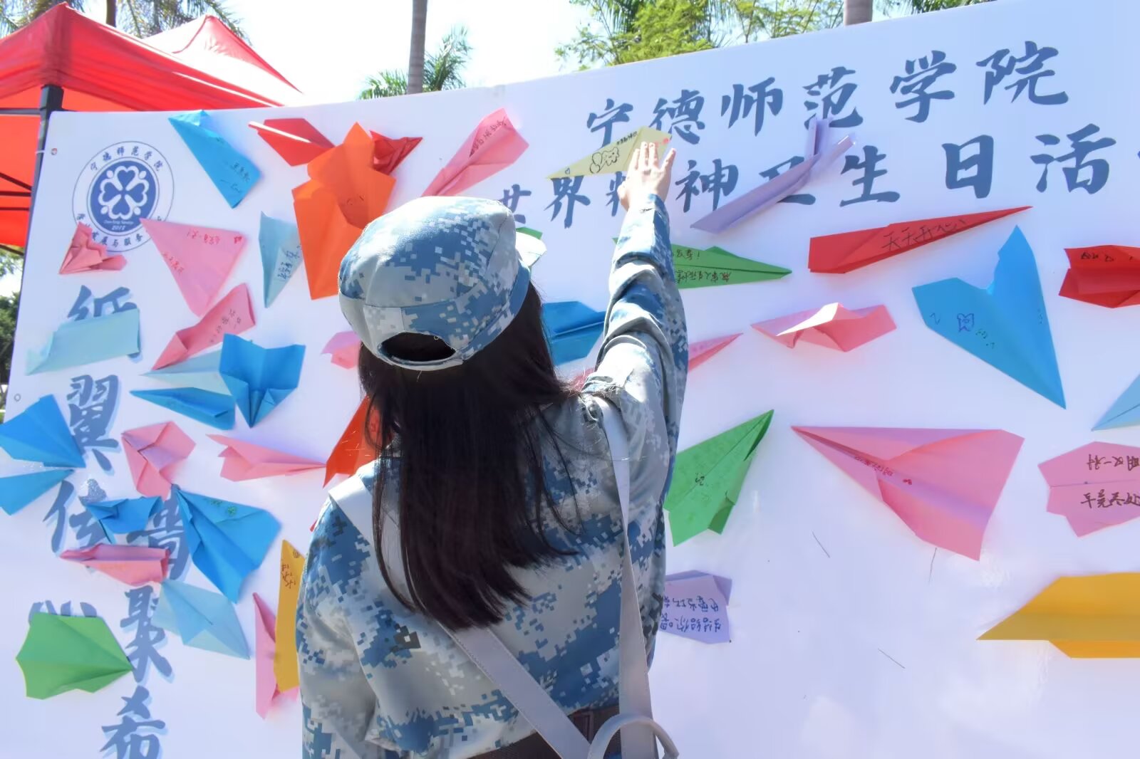 10月10日,在东侨校区花海广场和蕉城校区21号教学楼同步开展“纸翼传心,墙聚希望”活动。 师生们现场用彩色纸折制纸飞机,将心愿或期许写于其上,并将纸飞机贴成“希望之墙”。 在折、写、贴的过程中,师生们抒发了内心憧憬,在集体创作中深刻感受心灵联结的力量。 “石绘心声,共护心灵”活动则采用线上线下联动的形式举办,同学们在石头上绘制图案、书写心声,以艺术创作的方式释放情绪压力,与自我对话,增强了自我关怀意识。