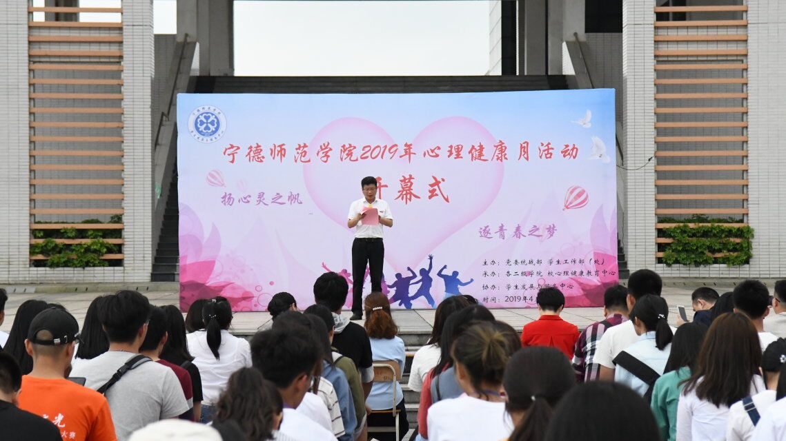 为进一步提高大学生心理健康意识,树立健康理念,积极营造健康和谐的校园氛围,4月26日,我校2019年心理健康月活动开幕式在图书馆前广场举行。学生工作部(处)部(处)长毛茂峰出席开幕式并宣布心理健康月活动正式开幕。学生工作部(处)副部(处)长龚劲丹,工会副主席邓兵,宁德市心理咨询师协会常务副会长林新霞,以及各民主党派代表、辅导员代表和500多位学生参加开幕式。