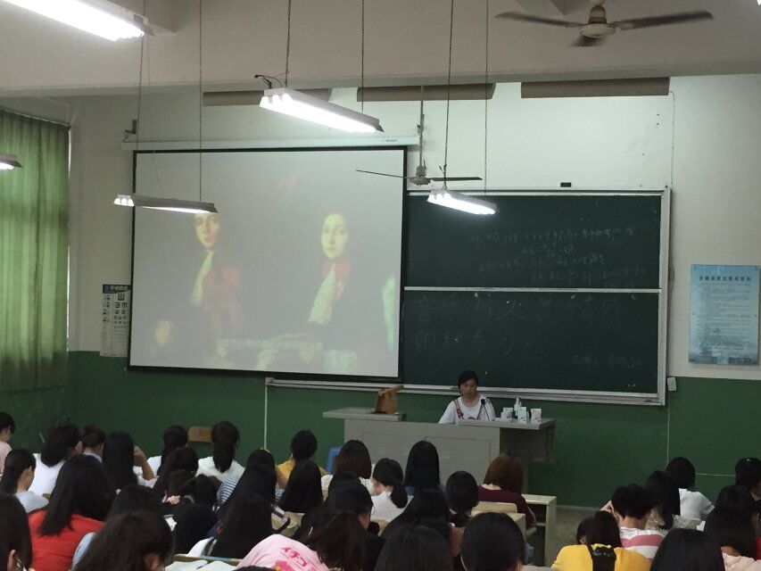 讲座开始,龚老师讲解了音乐的起源及其艺术形式,以及由创作过程到欣赏的过程:现实——情感——基本情绪及其运动状态——音乐作品。龚老师还通过举例子说明音乐与人类情感的关系是基于自然音响与人类情绪的先天的主、客体反映的关系上。讲座最后,龚老师就播放音乐视频:贝多芬的《欢乐颂》让同学们亲身感受音乐中的基本情绪,还播放了《十面埋伏》和维瓦尔第的《春》,两首曲子中的情感形成对比,让人印象深刻。