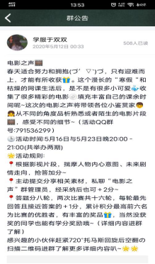 为丰富大学文化生活,促进校园精神文明建设,缓解师生焦虑情绪,推动我校疫情期间心理健康工作的推进,学生发展与服务中心结合当下疫情特殊情况,以线上的形式举办“五月心理健康月”活动。2020年5月9日与5月16日晚20时,由宁德师范学院学生发展与服务中心的办公室部门主持开展了主题为“电影之声”的网上心理活动。此次活动面向学院全体学生,参与人数达300余人,活动由办公室阮瑶瑶、黄海杰、许斌扬同学主持。