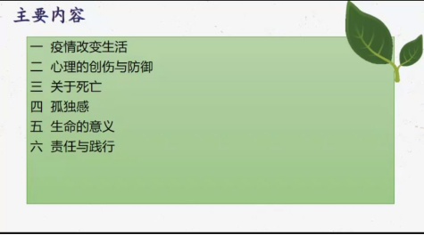 讲座主要由六个部分组成。程老师一开始先分享自己在疫情期间的生活与感受,以及怎样度过那段感觉与生活渐渐脱轨的日子。在疫情期间,枯燥、无聊是我们每一个人的正常反应。然后,程老师从心理的创伤、关于死亡、孤独感、生命的意义、责任与行动这五个方面,引导同学们理解生命的意义,感受生命的价值,对生命进行深刻的思考等,让同学们以更好地心态面对此次疫情。