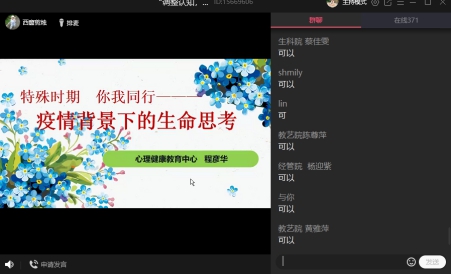 在讲解的过程中,通过对每部分举例子的方式,让学生能够更加深入的对生命进行理解与思考,认识生命的脆弱与短暂。对于生命的防御,要懂得提前压制创伤,有警惕性、自我调节能力。最令人记忆犹新的是程老师对于“人道主义”的解释:把别人的生命和自己平等对待,人人平等;关于孤独感,每个人都有孤独感,孤独感包含三个方面:一个人呆着、众多的人聚在一起但内心仍孤独、人生而孤独。从这三方面,老师告诉我们应如何去克服孤独,让我们深知:只有爱才能克服孤独。而后总结了人生的意义与责任,教会我们理解生命的价值与意义,让我们能够忍受疫情期间枯燥的内心,减少内心的难受,自我调节。在互动环节中,有同学提到应怎样改变讨好型人格,以及其他的困惑,老师对此进行了详细的分析与总结。此次讲座圆满结束,同学们收获颇多。