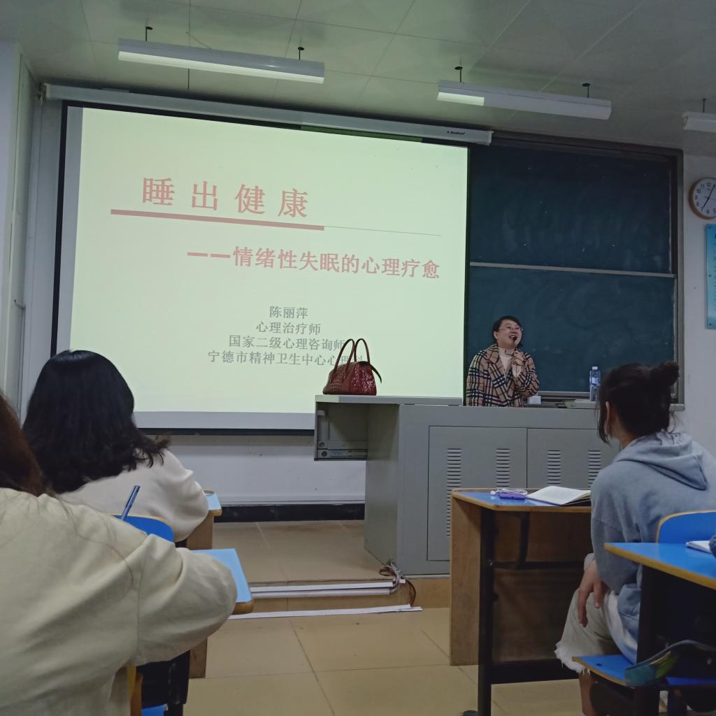 当晚,学工部(处)邀请宁德市精神卫生中心心理治疗师陈丽萍医生在新区求知楼C区101开展以“睡出健康一情绪性失眠的心理疗愈”为主题的讲座。来自各学院的100多位同学聆听此次讲座。