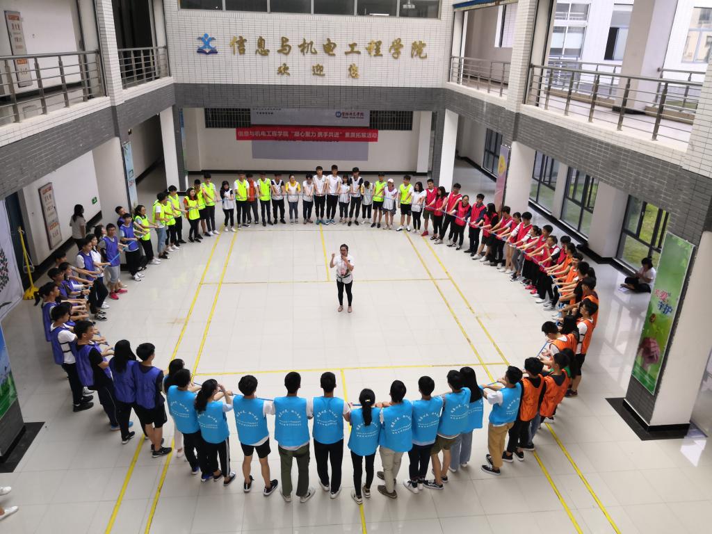 5月12日下午,心理健康月系列活动之“凝心聚力 携手共进”心理素质拓展在求是楼大厅开展。校学生工作部(处)心理健康教育中心主任、国家二级心理咨询师欧嘉烟老师和经济管理学院辅导员、国家二级心理咨询师吴玉芳老师应邀为信息与机电工程学院团委学生会80多名学生开展活动。