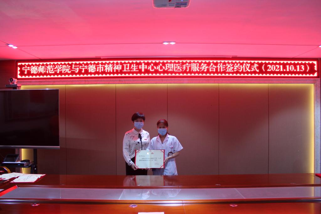 仪式上,双方签署了合作协议,为宁德师范学院和宁德市精神卫生中心共建“心理危机预防与干预合作单位”挂牌。龚劲丹为宁德师范学院心理健康保健和精神卫生工作顾问及《大学生心理健康教育》课程兼职教师颁发聘书。