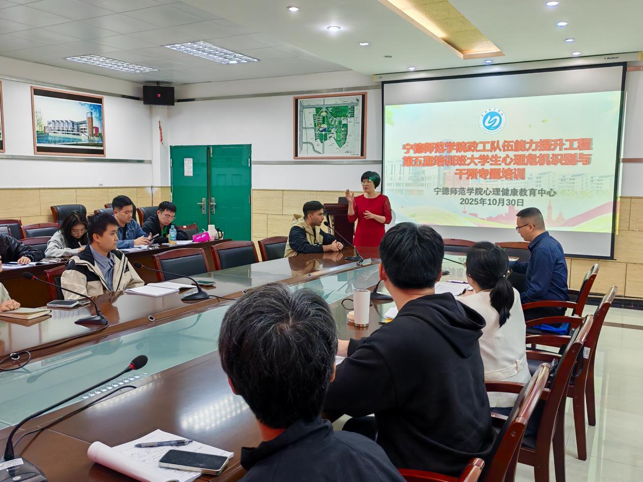 为提升辅导员对学生心理问题的识别和应对能力,构建以全员参与、及早发现、及早报告、及早干预的大学生预防性心理危机感知体系,2025年10月30日下午,学生工作处在求知楼A308会议室举办第五期政工队伍能力提升工程大学生心理危机识别与干预专题培训班,邀请宁德市康复医院心理治疗师木太力普·马合木提医生主讲,学工处副处长余碧春、全体辅导员以及心理健康教育中心全体专职教师参加培训。本次培训由心理健康教育中心主任元佳珺主持。