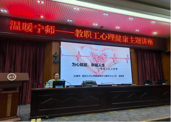 为切实加强教职工心理健康服务水平,进一步营造温暖、健康、积极向上的校园文化氛围,2025年11月13日,由学生工作处心理健康教育中心策划的“温暖宁师”润心向阳主题活动之“为心赋能,幸福人生——压力与情绪管理”专题讲座在行政楼三楼报告厅顺利举行。本次活动特邀福州大学心理健康教育与辅导中心主任许琳玲副教授担任主讲,面向全校教职工,旨在为大家提供专业、实用、有温度的心理支持。