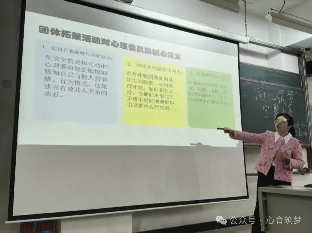 培训伊始,欧老师结合校园真实案例,通俗系统地阐释了团体拓展活动对心理委员工作的核心价值,明确其在班级心理支持体系中的关键角色。同时,欧老师拆解了团体活动策划、组织、落地的完整流程,着重强调“多提问少说教”“保密第一”“尊重个体感受”三大准则,为后续实践环节的有序开展筑牢理论根基。